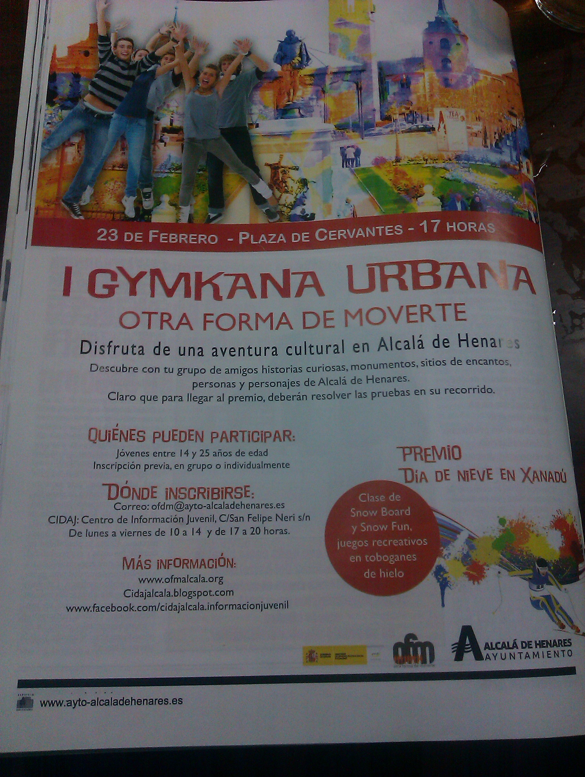 Pero ha habido una segunda ocasión, como decíamos, en la que parecería que otra vez una entidad dependiente del Ayuntamiento se ha inspirado en La Gran Evasión para desarrollar actividades de ocio. En este caso fue el pasado 23 de Febrero, cuando la gente de Otra Forma de Moverte invitaban a jóvenes de entre 14 y 25 años de edad a participar en una Gymkana Urbana que calificaban de Aventura Cultural y que animaba a descubrir en grupo historias curiosas, monumentos, sitios con encanto, personas y personajes de Alcalá resolviendo durante el recorrido ciertas pruebas. Os dejamos también una foto del anuncio publicado en el Puerta Madrid de la actividad.